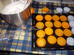 - Mettere nei pirottini con una sacca a poche o con un cucchiaio, al centro dei bianchini mettere un po di mandorle,io metto un po di albumi nel fondo del pirottino di carta poi metto un pò di scaglie mandorle e dopo riempo e cospargo di diavoletti